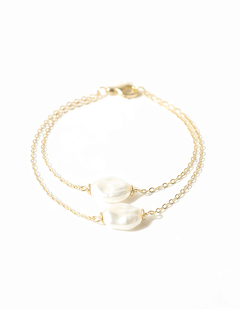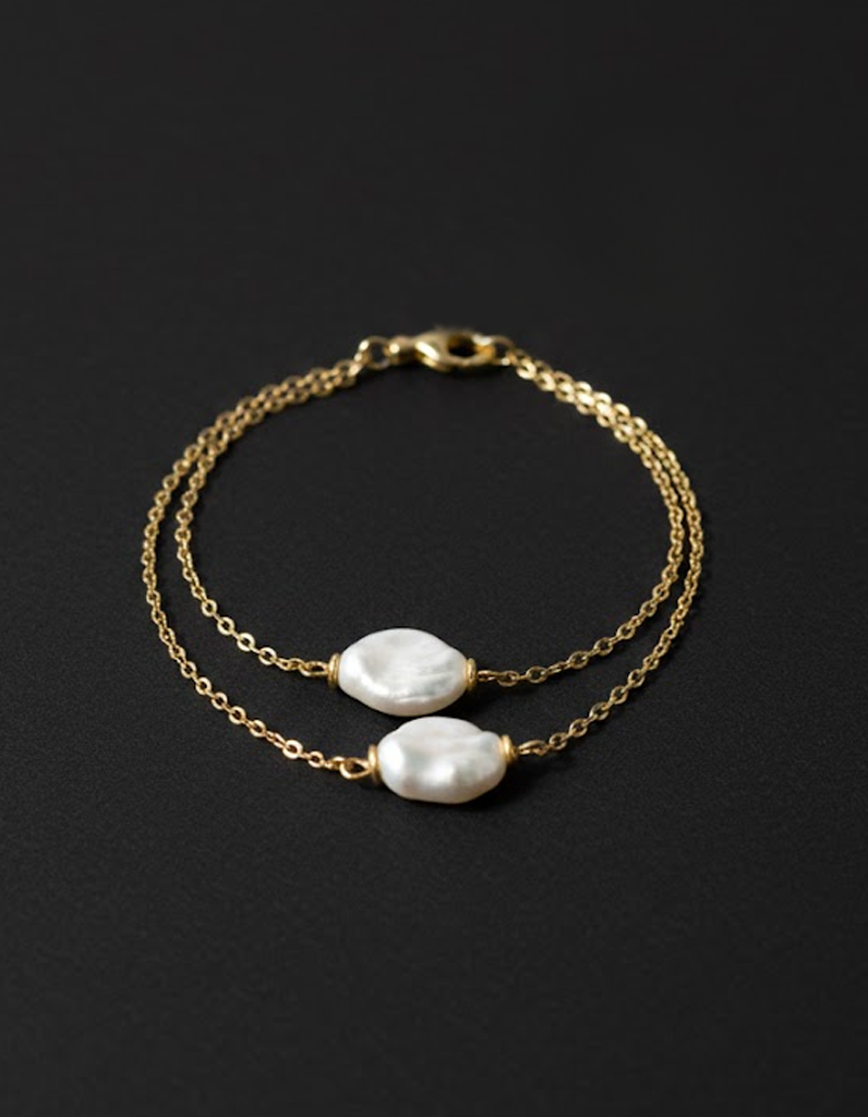The Double Layer Pearl Bracelet by Ma Jewelz features two fine gold-tone chains adorned with softly shaped pearls, creating a balanced and contemporary layered look. The minimal design enhances the natural elegance of the pearls while maintaining a refined silhouette.