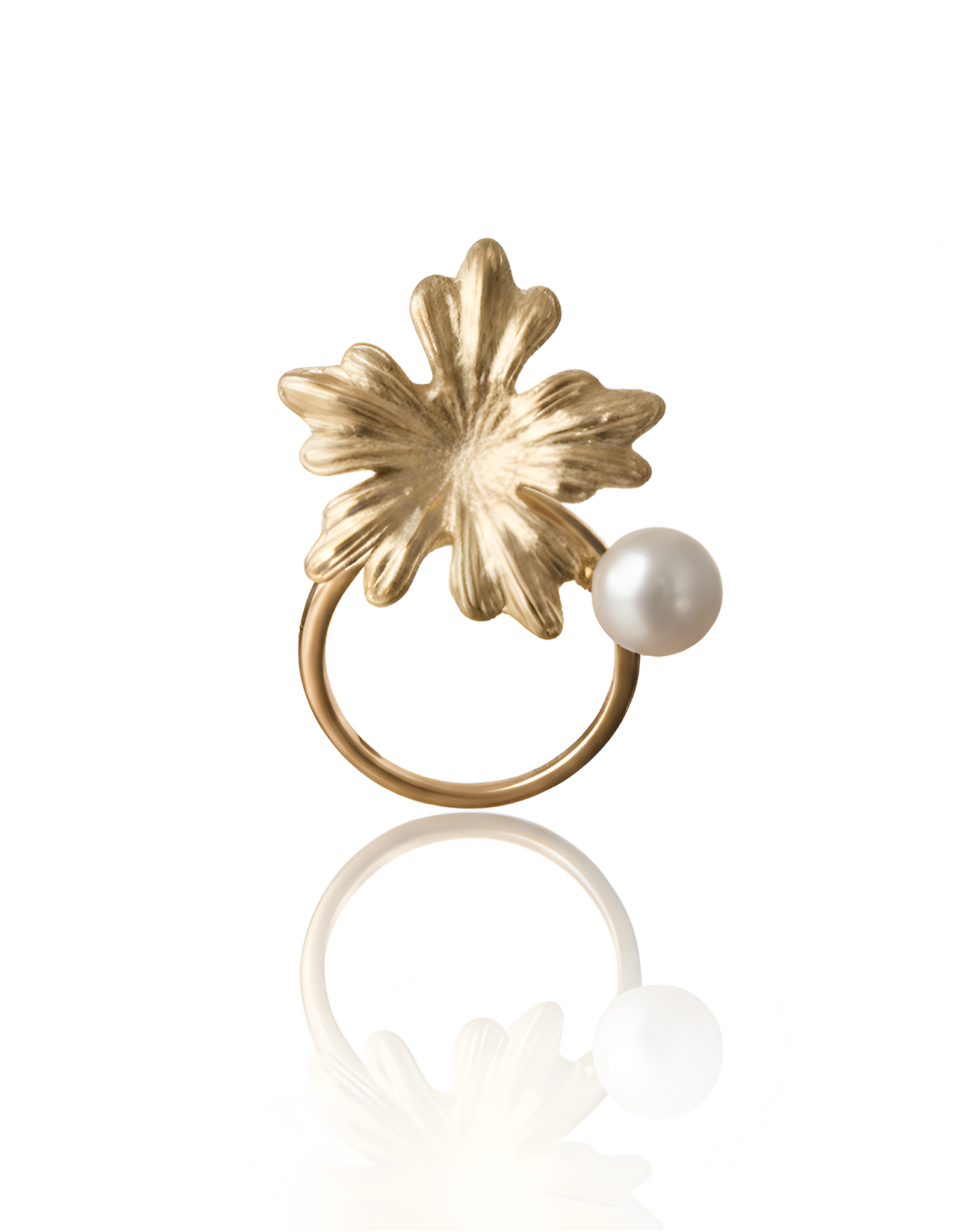 Graceful floral pearl ring featuring sculpted gold petals with a delicate pearl accent. Elegant, lightweight, and designed for refined everyday styling.
